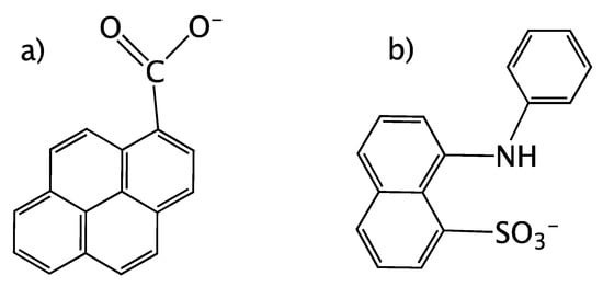 Luminescent anions: (a) 1-pyrenecarboxylate and (b) 8-Anilino-1-naphthalene sulfonate, respectively.