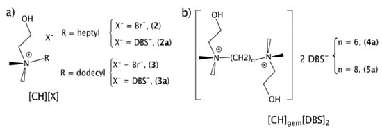 The interesting capabilities of DBS anion in inducing hydrophobic/lipophilic and antimicrobial properties as well, led to focused research on DBS based surface active anionic ionic liquids (SAAILs). Keeping in mind the mandatory principles of eco-sustainability, the selected cholinium cations (CH) were chosen as counterparts. The newly synthesized ILs include the heptyl and dodecyl [CH][DBS] derivatives, 2a and 3a, respectively, (Figure 9a) and the two germinal [CH]gem[DBS]2, 4a, and 5a, respectively (Figure 9b). The latter two differ in the connecting methylene chain length (at 6 and 8 C atoms, respectively). For comparison, the bioactivity of the CH halide precursors (2 and 3, respectively) has also been investigated. [De Leo et al. in prep.] The precursors 4 and 5 have not been considered because, in preliminary tests performed at different concentrations, they did not show any antimicrobial activity.
