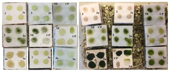 The tests have been carried out on a mixed stabilized microbial suspension (Gram+ and Gram-, yeasts, hyphomycetes, and unicellular algae) on untreated (CP) stone probes (marble and calcarenite), treated with consolidant only (NanoEstel, NP) or treated with the consolidant and ILs, namely 2, 2a, 3, 3a, 4a, and 5a, respectively. As shown in Figure 10, after 90 days of incubation in laboratory conditions (22 °C and at a constant illumination of ca. 1500 Lux), different behavior of the tested ILs was observed. In fact, 2 and 2a, and, especially, 3 and 3a, showed interesting antimicrobial colonization capabilities. On the contrary, 4a and 5a, promoted a remarkable microbial growth, even more pronounced than the untreated control sample. Such findings corroborate, once more, that is the IL lipophilicility that determines their bioactivity in that 3 and 3a, featuring longer alkyl chain lengths on the CH cation resulted in the most effective ones.