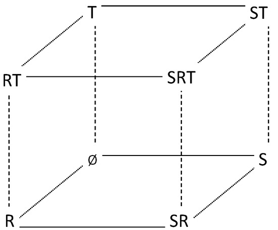 In Figure 1, the solid lines present the worlds at both ends are distinguishable for S, and the dotted lines are for R. The dashed lines are for T. Accordingly, the dotted lines and the dashed lines are indistinguishably a relation for S. The solid lines and the dashed lines are indistinguishably a relation for R. The solid lines and the dotted lines are indistinguishability relation for T.
