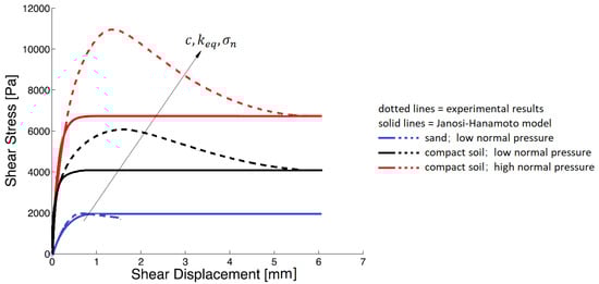 with bring the normal pressure (p in Bekker law). Values of the above mentioned empirical parameters , c, and n can be found in the literature [37] for several terrain types. Also numerical methods for their real time determination have been developed [38]. These iterative algorithms allow to know some variable terrain characteristics during tracked machine motion. Focusing on tracked or wheeled vehicles on deformable terrain, the values for rubber-soil metal-soil contact are very similar to the soil internal friction angle. Adhesion values between rubber and soil or metal and soil differ from cohesion values [39]. If a shearing action is exerted on the soil by a track or a wheel, shear displacement of the terrain occurs. The shear displacement j is equivalent to the relative motion between track and soil (slip). As discussed in the following sections, the traction force developed by a tracked machine coincides with the integral of Equation (2) on the track area in contact with the soil. If no slip occurs no drawbar pull is developed. As shown in Figure 1 Janosi-Hanamoto law differs from experimental results in particular for compact terrains and high normal pressure [40]. Janosi-Hanamoto law expressed in Equation (2) is monotone increasing, whereas shear stress-shear displacement curves for dense frictional-cohesive soils exhibits a maximum [41]. To model a maximum in the shear stress—shear displacement behaviour other formulations are available in the literature [31].