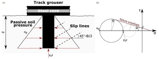 Equation (2) was implemented in the MTB model developed in this paper and also in other similar MTB models available in the literature [19]. As discussed, the application of this equation can be justified for loose soils and low normal pressure values. In the present MTB model Equation (2) was also used for compact agricultural terrain due to the limited normal pressure on the soil exerted by the small size tracked vehicle. Focusing on the interaction of a cutting surface as a blade or a grouser with the soil, passive earth failure must be considered. In fact, the terrain in front of the cutting blade or behind the grouser can be brought in state of passive failure, due to the applied force [37]. According to Mohr criterion the passive failure of a soil prism occurs when the principal stress on its vertical sides is reached (Figure 2).