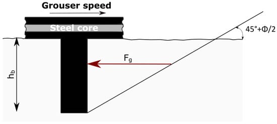 It has to be pointed out that the passive earth pressure approach should be integrated also considering the existence of friction and adhesion on grouser vertical sides. Furthermore because of the existence of shear stress at grouser-soil interface the normal pressure considered is no more a principal stress and the vertical surface of a grouser can be inclined with respect to the horizontal plane of the terrain. Reference [34] proposed a mathematical solution to correctly evaluate the force applied by a grouser taking into account its inclination and the presence of shear stress on its sides. Bekker proposed an equation based on an elastic stress distribution into the soil in order to consider the traction force developed by the vertical shear areas of a grouser. In Reference [42], Reece proposed a different equation based on static equilibrium to consider the same contribution. He formulated an equation of the total traction force given by a grouser considering the latter as a cutting surface and referring to a failure state of the soil.