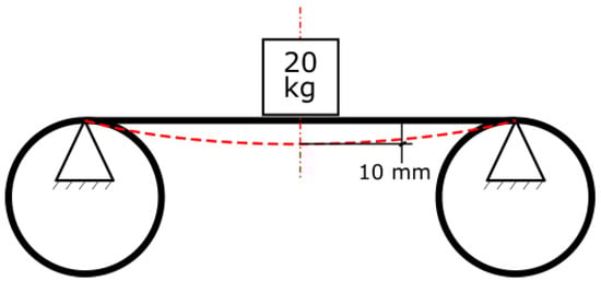 Small size tracked machines are usually equipped with rubber tracks. They have a steel core which gives a greater tensile strength. To obtain a track model with behaviour and properties similar to a real rubber track it was necessary to properly model the joints between consecutive links. In this work a bushing element was considered (Figure 4b). Three-dimensional bushing joints allowed to transmit elastic and damping forces and torques between two consecutive links. The required stiffness and damping coefficients were defined applying specific loads and comparing the virtual track behaviour with a reasonable response of a real one. In particular, a static test as the one shown in Figure 5 was simulated to see if the tensioning force and the proposed parameters for the bushing elements were coherent with the deflection of a track with a mass of 20 kg placed in between the idle wheel and the sprocket. Stiffness values are listed in Table 2.