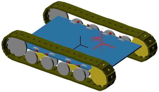 Negligible displacements and angular misalignments in x and y directions between two consecutive links were obtained using high translational and rotational stiffness values along those directions. Comparing the deformed shape of a real rubber track with the deformed shape of its MTB model, rotational stiffness in z direction was set. Track vibrations were limited by setting appropriate rotational damping in z direction, also considering rubber damping effect [43]. Idle wheels, driven wheels and oscillating plates with road-wheels were properly modelled (Figure 6). Contact forces were defined between each track link and each wheel. Low penetration depth and friction coefficient related to rubber-steel contact were defined. A damping value of 5.0 Ns/mm and a stiffness value of 100 N/mm were considered for the contact model of these elements. The driving wheel teeth insertion into links holes allowed torque transmission thanks to the contact force definition. In Figure 6 the position of the machine centre of mass (CM) is highlighted. Its position, as well as the overall moments of inertia of the vehicle are coherent with the vehicle characteristics shown before in Table 1.