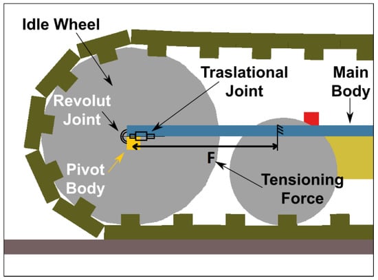 The track tensioning system was modelled so that the simultaneous rotation and translation of the idle wheel could be allowed (Figure 7). A translational joint was applied between a cubic pivot (dummy) body and the main body of the machine. The idle wheel was connected to the pivot body by means of a rotational joint. Considering typical tensioning force values for rubber tracks of small size machines, F force value (Figure 7) was set equal to 5100 N in such a way that the static track deformation would satisfy the test shown in Figure 5.