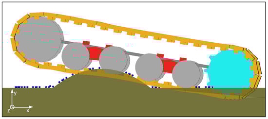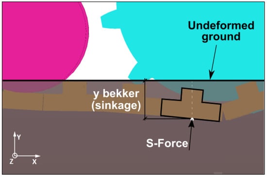 The sinkage value y was constantly given as the difference between the base of the track link and the lowest contact point of each sphere (function of the sphere CM position and its radius). In other words, the marker centred in the sphere CM was one side of the non-linear spring defined by Equation (1) and applied to the track link surface. As a result, the tracks sinkage and the machine position depended on the terrain characteristics and shape (Figure 9).