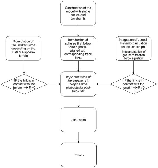 In this paper a MTB model of a tracked machine with a deformable terrain model was developed, also thanks to the authors’ research group previous experience in MTB contact [32] and vehicle modelling [33]. The main assumption of the model considers the terrain deformation located in a close area around the vehicle tracks. Thus, the soil deformation can be kinematically correlated to the track motion. The soil mechanics equations were implemented on each rigid body used to model the rubber tracks. Each link is connected to each contiguous one by means of bushing elements aimed to replicate a realistic track elastic characteristic. Soil mechanics equations were implemented through a specifically designed routine which solved only the equations for the track links in contact with the terrain. The algorithm defined at each iteration the forces applied to each track link in contact with the terrain. Moreover, the effects of grousers in the overall tractive performance of the machine were investigated. To model grousers effects, soil mechanics equations related to passive terrain failure [34,35] were considered and machine draw-bar pull was evaluated for different types of soil.