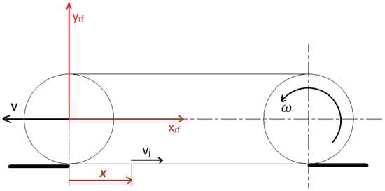 i is also known as slip coefficient, is the theoretical speed of the vehicle, v is the actual one and is the relative speed between track portion and soil. In other words, is the absolute link speed in x direction: when no slip occurs the track link in contact with the terrain is still. In this approach, the x coordinate is correctly identified as in Figure 11 and the theoretical speed is defined by Equation (10)