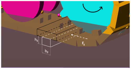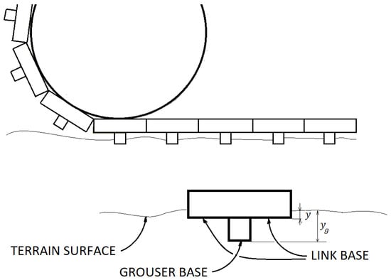in which is the link base area (Figure 13); differs from y by the grouser height. Also, for the traction force developed by grousers no new force elements were introduced into the MTB model. The expression of the new force contribution was integrated into the existent traction force routine implemented for each track link. The resultant equation was a parametric equation in which grousers number and dimensions could be changed. The traction force offered by a grouser is related to the passive soil pressure and expressed by Equation (6), where q is different from zero only if the link base touches the soil. In fact, it represents the surcharge acting on the terrain surface portion under the grouser. For this reason, it can be set equal to the Bekker pressure acting on the link base. The grouser height sunk into the soil depends on soil characteristics and Bekker equation. To sum up, the whole traction force equation implemented on each link force element depended on two contribution: the shear stress between link and/or grouser base and soil, and the grousers cutting action. If the whole grouser sank into the terrain and the latter touches the link base, the traction force expression for the link is reported in Equation (14).
