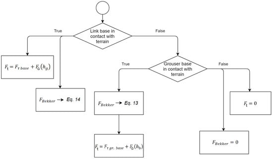 The algorithm of the routine related to the traction and Bekker forces for a single-track link with grouser is summarized in Figure 15.