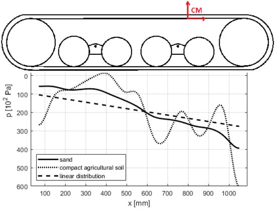 The same test was performed on sand and compact ground. Selecting the same location on the ground body (rigid), it was possible to evaluate different track deformation and sinkage for the two types of soil. The highest sinkage reached on sand was equal to 50 mm, whereas the maximum sinkage value on compact agricultural terrain was equal to 8 mm, because of the higher equivalent stiffness. Dividing the Bekker force values acting on each track link by its base area the pressure distribution both for sand and compact soil was obtained (Figure 16). A linear pressure distribution was also plotted to simply show the influence of the CM position and modifying the simplified assumption of constant pressure under tracks proposed in Reference [37].