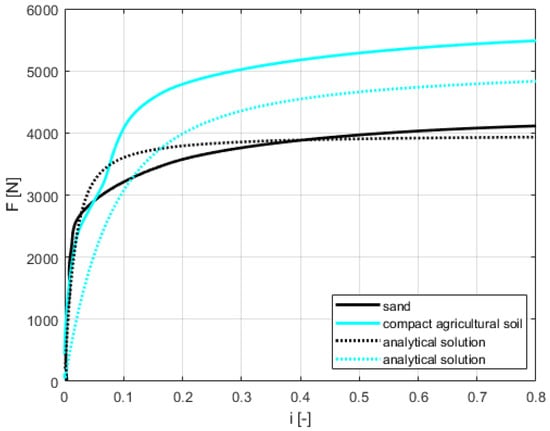The maximum traction force value reached on compact agricultural soil was greater than the traction force value on sand, mainly due to higher and c values.
