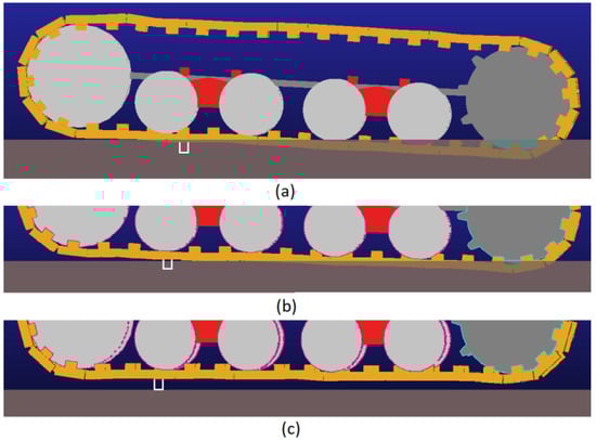With 25 mm height grousers the global vehicle sinkage was slightly smaller (Figure 18b), according to Bekker force acting on grousers base area. On compact agricultural soil grousers partially sank into the ground, but the latter did not come into contact with track links base (Figure 18c). Figure 18a–c highlight just one grouser for the sake of clarity. However as discussed before, simulations take into account the effects from all the grousers of the tracks.