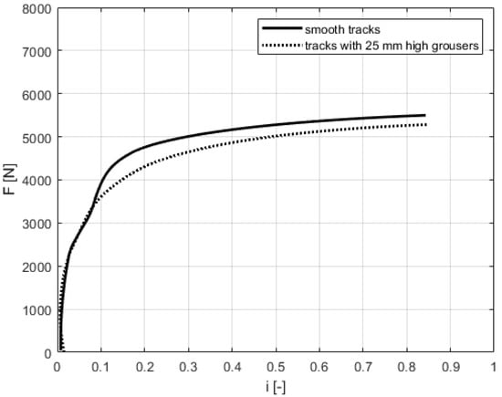 In order to evaluate the drawbar pull developed by a tracked machine the contribution in terms of traction force offered by grousers must be considered. The traction force equation presented in the previous section, and implemented for each track link, considered only the shear stress between the track flat surface and the soil. Focusing on rubber tracks with lugs, the cutting action of grousers sunk into the soil must be considered. In fact, grousers generate a greater traction effort contribution. This contribution varies with soil characteristics and grousers number and dimensions. In the presented model grousers as large as the track and 25 mm height were considered, one for each link.