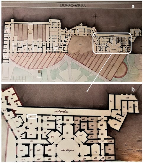 (a) Map of the remains of the Domus Aurea which consists of a series of buildings separated by gardens, woods and vineyards; (b) a detail of the area where the study site, Room 93, is located.