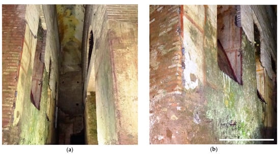 Two different views of the sampling site in Room 93 with the evident phototrophic biofilms causing discolouration of the walls. (a) front view of the corridor present in Room 93; (b) detailed image of the wall object of the investigation with the evident presence of the green biofilm; scale bar = 2 m.