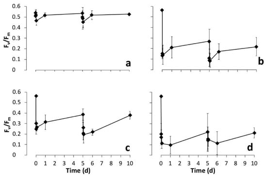 Photosynthesis, the most fundamental and intricate physiological process in phototrophic organisms, is highly sensitive to the majority of stresses (biotic or abiotic) [32]. Therefore, a measure of chlorophyll fluorescence could be considered as a good indicator of the effect of plant extracts on the vitality of the biofilm phototrophic component. A mini-PAM portable fluorometer was used to measure the maximum quantum yield immediately before each treatment (days 1 and 5) and then at 5, 30 and 90 min, 1 and 5 days after each treatment (10 days in total).