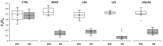 Changes in photosynthetic yield before each treatment (Pre) and after 5 days (5d) (n = 12). Control (CTRL), benzalkonium (BENZ, positive control), lavender at 5% (LAV), liquorice at 10% (LIQ) and a mixture of lavender 5% and liquorice 10% (LIQLAV).