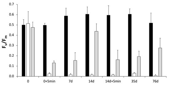 In situ treatment of biofilms growing in Room 93 of the Domus Aurea, Rome. Three treatments (CTRL (black), BENZ (white), LIQ (grey)); two applications, the first on day 0 and the second on day 14. PAM fluorometer measurements of yield were made immediately before both treatment applications (0 and 14 day), 5 min after (+5 min), then on days 7 and 14 after the first application, and then on days 35 and 76 (n = 3).