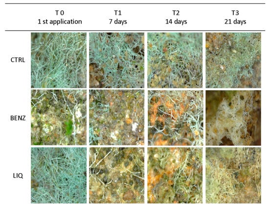 In situ Digital Microscope pictures of the treated surfaces at different time intervals acquired with Handheld Digital Microscope (USB) Dino-Lite Premier 1.3 MP (AnMo Electronics Corporation, Taiwan). The effect of LIQ and BENZ on the discolouration of the biofilms is evident.