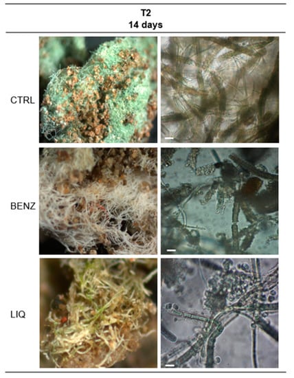 The biofilms collected 14 days after the first application were transferred to the lab and observed using light and stereo microscopes (Figure 8). As already observed with PAM measurements, both in situ and lab images showed that BENZ had a stronger effect on the photosynthetic cells, particularly evident in the filaments of S. julianum that turned from green to white. The liquorice extract also had a visible biocidal effect, albeit at a lower level, where photosynthetic cells turned from green to light yellow, although this was possibly due to the staining by the liquorice extract itself on the carbonaceous sheath of S. julianum. While it was not possible to continuously follow the biofilms, it would be intriguing to know if the presence of some green filaments in the liquorice-treated area were a sign of recovery by some resilient cells that could support the PAM fluorimetry data.
