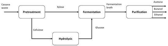 The study presented here contemplated a topological pathway for the production of biobutanol from lignocellulosic biomass (cassava waste) through the biochemical pathway of acetone-butanol-ethanol (ABE) fermentation. The process comprised of four central stages: (a) pretreatment unit, (b) hydrolysis unit, (c) fermentation unit, and (d) purification unit. Globally, the process begins with the processing of raw material (lignocellulosic biomass) that entered the plant already cleaned and crushed. In this case, biomass was chemically treated to let obtaining solubilized five-carbon carbohydrates (xylose and arabinose) and cellulose [23]. Through filtration and separation stages, this section provides two main outlet streams (solid phase and liquid phase) that follow to hydrolysis and fermentation stages, respectively. It is worth mentioning that this study set the modified non-random two-liquid (NRTL) model and the Redlich–Kwong (RK) equation to model and estimate substance property and equilibria for this topology [24].