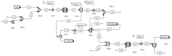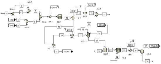 The above procedure is needed because direct distillation does not guarantee successful separation of the not desired component that allows obtaining succinic acid at an analytical degree. The outlet stream from RX-7 (stream 70) passed through filtration (FT-8) for the removal of lye and sodium sulfate (solid components), and continued to the vacuum distillation unit (DT-3) allowing for water removal. Finally, the bottoms stream of vacuum distillation was cooled (HX-9) and crystallized (RX-8) under 4 °C, obtaining the product with a purity of 98.2% and mass flow rate of 13,865.7 kg/h [57]. Table 7 summarizes the stoichiometric equations of simulated stages and their corresponding reactions for topology 1.
