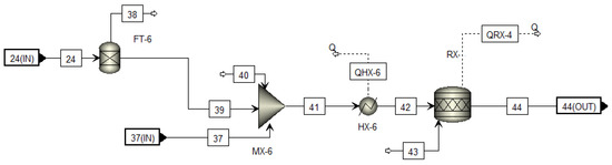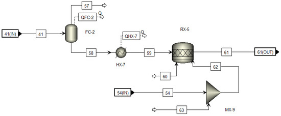 Stream with soluble sugars (glucose and pentose) were mixed before entering the ABE fermentation system. Both reducer sugars were converted in acetone, butanol, and ethanol through saccharolytic clostridia strain [36]. ABE fermentation (RX-4) was performed at 35 °C [37], under anaerobic conditions [38], and keeping water content above 80%, in which stream 40 supplied required water to meet this condition. Several chemical reactions and mechanisms occurred during the fermentation operation. Other side products like carbon dioxide, hydrogen (fermentation gases), acetic, and butyric acid, among others were produced [39]. It should be noted that there was also a generation of biomass accumulation that groups solid fermentation residues represented as cell biomass (CH1.64O0.39N0.23S0.0035) [40]. Figure 4 displays the process flowsheet of the fermentation stage in topology 1. In this work, this reaction system followed the configuration reported by Haigh et al. [41], which described that through continuous separate hydrolysis and fermentation, the system could reach production yields of 61.74% for butanol, 28.61% for acetone, and less than 1% for ethanol. It should be noted that butanol production was prioritized, so the selection of the ABE fermentation reaction configuration obeyed that goal. After this stage, the process continued to the separation unit for the extraction of desired products.