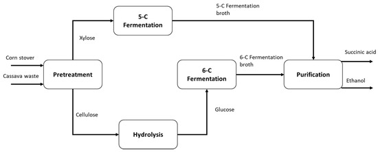 The main flow in the pretreatment stage was divided into the liquid stream (mainly xylose) and solid stream (mainly glucose). The first one was directly directed to the five-carbon fermentation stage for ethanol production [49]. Otherwise, the solid stream with non-dissolved cellulose was sent to the hydrolysis unit for glucose formation via enzymatic action. The outlet stream from the hydrolysis section entered the six-carbon fermentation unit in order to produce succinic acid as the main product and acetic acid as a byproduct through biological processes [30]. Both leaving streams from the fermentation processes were sent to the purification stage in order to extract succinic acid and ethanol at high purity concentration. The following sections explain more technical details associated with the modeling and simulation of the described pathway for succinic acid and ethanol coproduction. In this case, the NRTL method was selected as the thermodynamic model for property estimation considering recommendations made by the National Renewable Energy Laboratory (NREL) and its reported Aspen Database for estimation of biofuel processing substances [34].