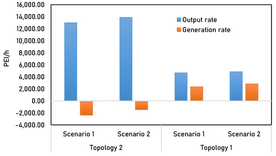 It is worth noting that in both topologies, energy usage affects profoundly impacted this category, since for scenario 1 in topology 1, the generation rate was −4.37 × 10−5 PEI/kg, while in the same scenario for topology 2, this value corresponded to −4.41 × 10−4 PEI/kg. The obtained rates of PEI for GWP and ODP categories remained in shallow values, indicating that these bioprocesses would not represent significant concerns in terms of global atmospheric pollution over time. The analysis of atmospheric impacts also included an evaluation of the output rate of PEI for belonging categories in this group, and these results are shown in Figure 15.