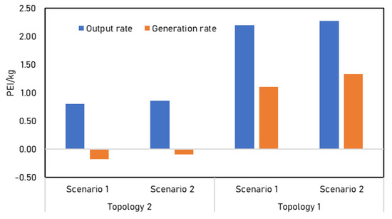 It should be noted that the output rate of PEI refers to the possible amount of environmental impact that leaves a system together with mass and energy flows, and this quantity includes the rate of generated impacts directly derived from process operation. In this sense, it is palpable that the output rate of PEI of the PCOP category was equal to the generation rate for topology 1 (0.885 PEI/kg) and topology 2 (0.12 PEI/kg). Similar behavior was presented for the AP category. These impacts are mostly associated with product streams and energy generation that could potentially accelerate photochemical smog formation and medium acidification in these systems [71]. Comparing the obtained atmospheric categories in both bioprocesses, it is evident that topology 2 showed better environmental performance than topology 1, with lower output rates of PEI on the mass basis in all categories.