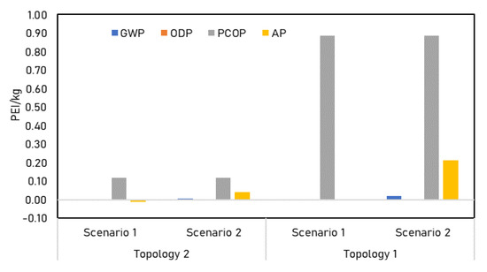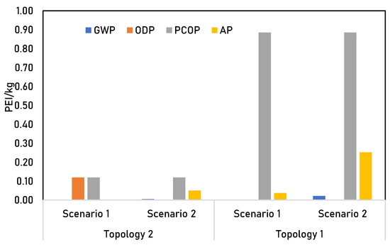 This section of the analysis revealed that topology 1 showed higher rates for generation of environmental impacts than topology 2, especially in PCOP and AP categories. With the production of 0.885 PEI/kg for topology 2 (in both scenarios) in the photochemical oxidation potential category, while in topology 2, these rates corresponded to 0.12 PEI/kg (also in both scenarios). These results evidenced that topology 1 would generate more volume of substances that can remain over time in the atmosphere due to their low oxidation [70]. Another impacted category in topology 1 was the AP category. This fact is associated with the rates of impacts derived from energy generation.