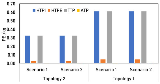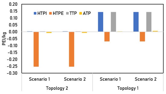 Excellent outcomes were obtained in the generation rate for the human toxicity by dermal exposure (HTPE) category in both evaluated topologies, showing negative magnitudes for this factor in all scenarios. In this sense, topology 2 obtained a rate of −0.25 PEI/kg in scenario 1 and scenario 2, while topology 1 showed −0.07 PEI/kg also in both scenarios. These results mean that the process would emit fewer toxic substances that affect human toxicity by dermal exposure or inhalation than those that entered the systems. Similar behavior was evidenced in topology 2 for human toxicity by ingestion (HTPI), terrestrial toxicity potential (TTP), and aquatic toxicity potential (ATP) categories but with lower rates of environmental impact consumption. Otherwise, topology 1 showed generation rates of PEI for HTPI and TTP categories of 0.143 PEI/kg in both scenarios, firsts indicating that this process generates associated impacts in human and terrestrial toxicity. In a second case, these results evidenced that the energy supply did not affect the generation of impacts in the toxicological categories. As developed for the previous section, the analysis presented the examination of the output rates of PEI for the toxicological group, and these results are shown in Figure 17.