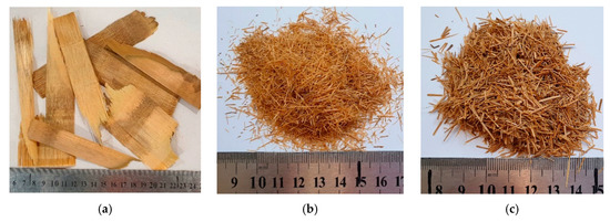 Bamboo fibers. (a) Raw waste material; (b) 300 µm-diameter fibers after grinding and sieving; and (c) 500 µm-diameter fibers after grinding and sieving.
