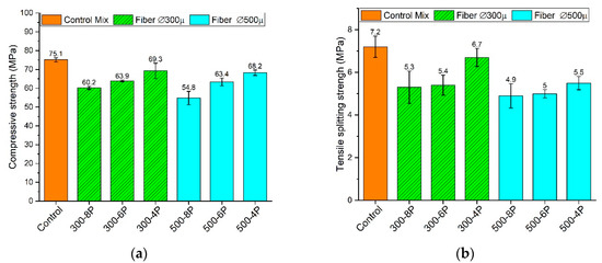 The control mixture showed a splitting tensile strength of 7.2 MPa. Similar to the trends observed in the compressive strength results, the splitting tensile strength of the samples with 8/6/4 V% of fibers was reduced by 6.9/25.0/26.4% for the 300 m fibers and 23.6/30.6/31.9% for the 500 m fibers (see Figure 4 and Table 3). It is worth noting that the splitting test setup compression is applied to a small area along the specimen resulting in tensile stress (lateral force) within the matrix which causes splitting. The splitting tensile strength is the maximum load before cracks appear and therefore the crack bridging behavior of the fibers is not considered in this test. This is investigated with bending tests and discussed later on. According to [57], the tensile strength of a mortar matrix can be assumed to be in the range of 10% of the compressive strength which matches the results obtained in this study.
