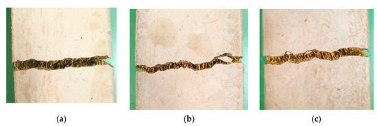 The control mix showed linear elastic behavior up to the peak load, which was followed by an abrupt failure, resulting in complete separation of the specimens into two parts. In contrast, the bamboo fiber mixtures exhibited improved post-crack behavior, resulting in a strain-softening behavior, where a single crack occurred within the central third of the prismatic samples. This effect can be seen in Figure 5 and Figure 6 where the pictures of the tested specimens taken after the bending tests are shown for both sets of samples containing 300 m and 500 m fibers. Within these figures, it is possible to visualize the fibers bridging the developed crack, which was much more evident as the fiber content increased from 4 V% to 8 V%.