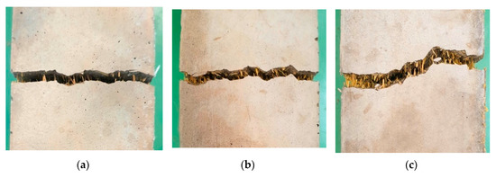 Photographs of test samples after bending tests involving 500 m fibers. Fiber content: (a) 4 V%, (b) 6 V% and (c) 8 V%.
