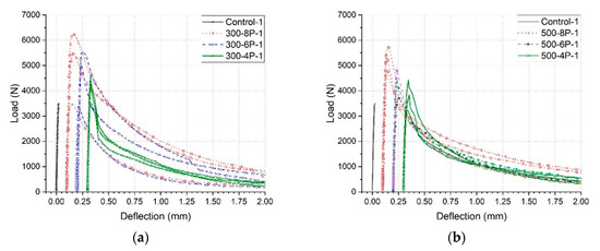 The load–deflection behaviors of all test specimens are shown in Figure 7. Test results with different fiber contents are plotted with an offset of 0.1 mm from each other for better visual comparison. Both fiber groups involving the use of 300 m and 500 m fibers, revealed similar trends, during which 8 V% mixtures exhibited the highest peak load and the mixtures with 4 V% the lowest. Furthermore, the bamboo fibers were able to bridge the developing crack, resulting in a strain-softening behavior in all bamboo mixtures. The post-crack behavior was more pronounced for mixtures with higher fiber contents, which was in line with the findings with Aydin Serdar and Hameed et.al. where it was shown that a higher fiber content results in a higher load-carrying capacity due to the crack bridging behavior of the fibers [58,59].