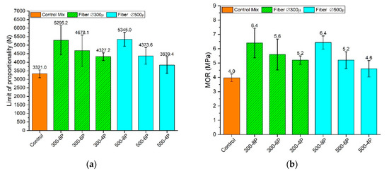 The limit of proportionality and the modulus of rupture are shown in Figure 8. It should be noted that one out of the 3 samples of the 300 m with 8 V% and 6 V% exhibited a significantly lower bending performance as can be seen in Figure 7. This resulted in a high standard variation shown in Figure 8. Samples with the 500 m fiber batch revealed a lower modulus of rupture compared to those containing 300 m fibers. These values were around 0.0%, 7.7% and 13.0% lower for the 8/6/4 V% fibers specimens, respectively. These findings were in agreement with ACI 544.1R-96, where a lower MOR was reported with decreasing aspect ratio of the fibers [60]. Longer and thinner fibers exhibit a higher bond within a concrete or mortar matrix resulting in a higher pull-out resistance compared to shorter and thicker fibers as shown which was also found by other researchers in [55,61].