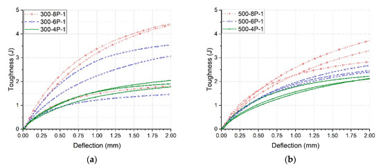 Cumulative toughness of the bamboo fiber reinforced specimens up to 2 mm deflection: (a) 300 m batch; (b) 500 m batch evaluated from the four-point bending test according to ASTM C1609 [52].