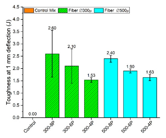 The toughness was calculated as the area under the load–deflection curve and expressed as energy in Joules. Accordingly, the resulting cumulative energy up to 2 mm deflection is shown in Figure 9 and Figure 10. As expected, a higher fiber content resulted in higher toughness. Thicker and longer fibers, as found in the 500 m batch, showed an overall reduction in toughness when compared to the smaller and shorter fibers in the 300 m batch. This is explained due to the higher bridge bearing capacity of the mixtures with a higher amount of fibers and a higher pull-out resistance for fibers with a higher aspect ratio as discussed earlier and shown in [59,61].