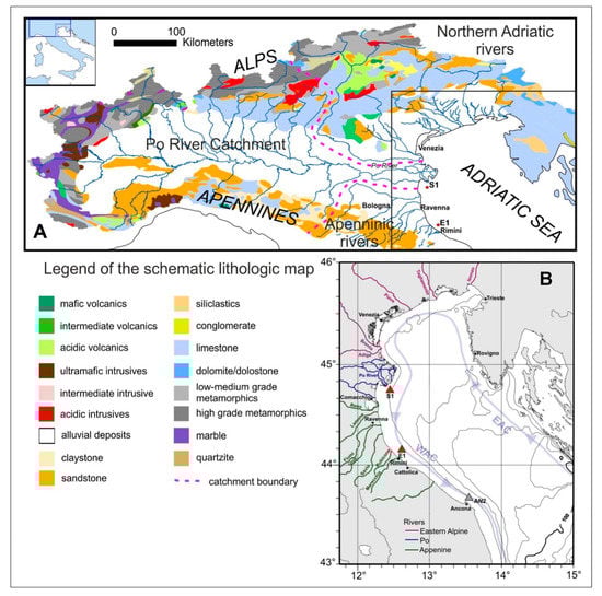 (A) Lithologic map of the Po River drainage basin (data from 1:1 Million Surface Geology—European Geological Data Infrastructure: https://egdi-v6.geology.cz/?ak=detailall&uuid=5729ffdf-2558-48fc-a5d2-645a0a010855). Major Po contributor rivers are also indicated. (B) Schematic surface circulation pattern of the Northern Adriatic Sea. EAC: Eastern Adriatic Current; WAC: Western Adriatic Current []. Triangles represent S1, E1 (this work, red triangles) and AN2 (grey triangle) [] coring sites.