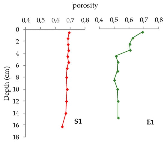 Porosity vertical profiles of S1 sediment cores do not show evident variations (values around 0.65–0.69, Figure 2). A slight decrease of porosity is detected only in the bottom layer documenting an increase of sediment compaction. On the other hand, the E1 sedimentary interval displays a larger variability of porosity (ranging from 0.50 to 0.69, Figure 2). The higher values are recorded in the first 4 cm with a clear decreasing trend and with the downward porosity stabilizing toward the lower values (Figure 2).