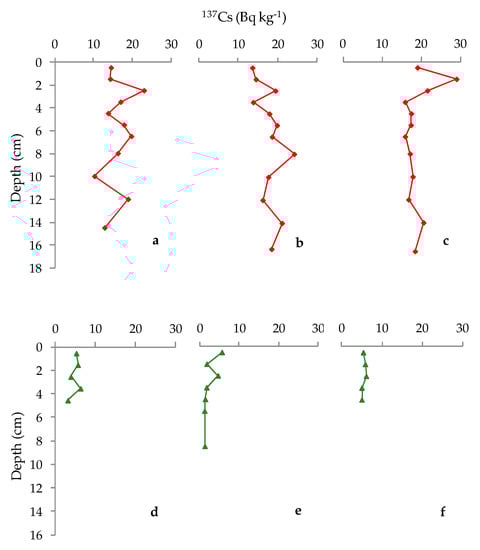Depth profiles of 137Cs for: (a) S1-EL14; (b) S1-ANOC16; (c) S1-INT17; (d) E1-EL14; (e) E1-ANOC16; and (f) E1-INT17.