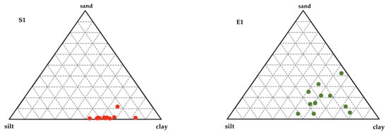 Grain size results are reported in Figure 4. The S1 sediments are composed prevalently by clay and silt fractions (around the 90%) in almost all levels, in line with the literature data [,]. The E1 sediments are characterized by a more heterogeneous composition; they consist of silty clays with high sand percentages (40%) in the surficial levels (Figure 4).