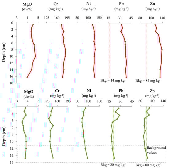 Depth profiles of cores from the S1 site show an increasing trend of the MgO contents upwards, relatively stationary concentrations of Cr and Ni and gradual decreasing upward trend of Pb (from 39 to 33 mg kg−1), whereas Zn shows a slight increase between −16 and −8 cm (from 132 to 138 mg kg−1) and then a decrease to 114 mg kg−1 Zn at the top (Figure 5). In cores from E1 site, MgO and Ni contents are relatively uniform, Cr reaches a peak at ~5 cm of 146 mg kg−1 and Zn and Pb contents show a moderate decreasing trend between 16 and 7 cm, a sharp increase between 7 and 2 cm and peaks at ~3 cm reaching 91 and 29 mg kg−1, respectively.