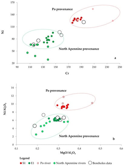 (a) Binary plots of Ni vs. Cr and (b) Ni/Al2O3 vs. MgO/Al2O3 ratios. Our samples are indicated as green and red dots. Reference data for rivers (light green, Apennines; light red, Po River) derive from tables presented in []. Reference data for boreholes (empty big circles) represent the average values presented in []. Provenances fields (green and red circles) are drawn in accordance with literature data [,,,,,].