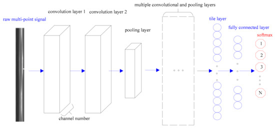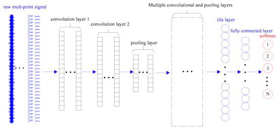 A schematic of a multi-point fault diagnosis model built using a 1-D CNN is shown in Figure 5. Here, the input data of the model is different from the previous section and it becomes an eight-channel signal. Therefore, the output value of each layer of neurons is the comprehensive response of the eight-channel signal. The convolution layer still uses a 1-D convolution kernel to perform the convolution operation.