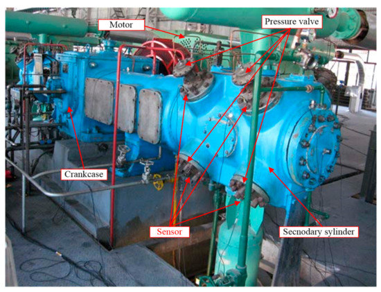 This experiment was carried out in the working unit of No. 1 compressor station of the South District of Daqing Natural Gas Company in China and the basic structure as well as the sensor (measuring points) arrangement of the reciprocating compressor is shown in Figure 9. These sensors were used to collect vibration signals, pressure signals, and key phase signals. Several acceleration sensors were utilized to collect vibration signals. The acceleration sensor and the pressure sensor are installed on the pressure valve, and the key phase sensor is installed near the shaft between the motor and the crankcase. The specific positions of the valves and sensors on the primary and secondary cylinders are as depicted in Figure 9. In addition, the actual positions of the valves and sensors on the secondary cylinder are shown in Figure 10.